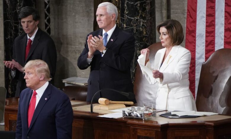 وبعد تسليمه نسخة من خطابه لبيلوسي، مدت الأخيرة يدها، إلا أن ترامب رفض مصافحتها واستدار للبدء بالكلمة، بينما علت الدهشة وجه رئيسة مجلس النواب.